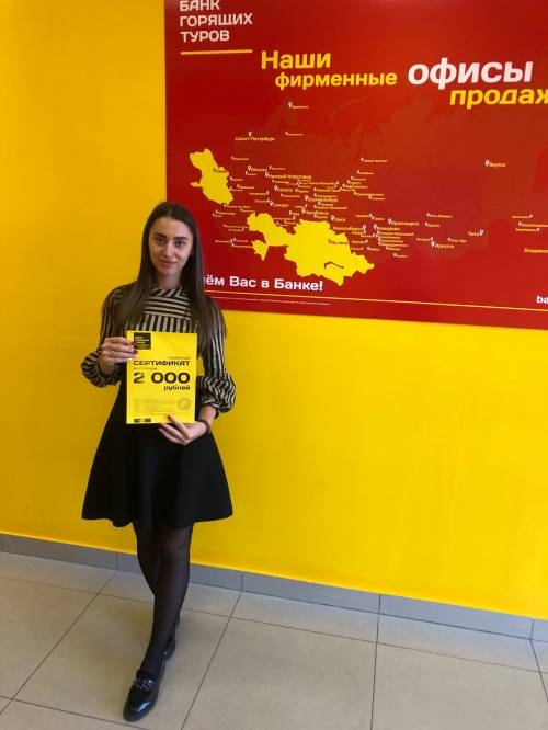 Обратилась в Банк горящих туров в Бийске потому как был подарочный сертификат. Понравился сервис в офисе продаж и удобный подбор тура на сайте компании. Жду скидок в будущем! ...
